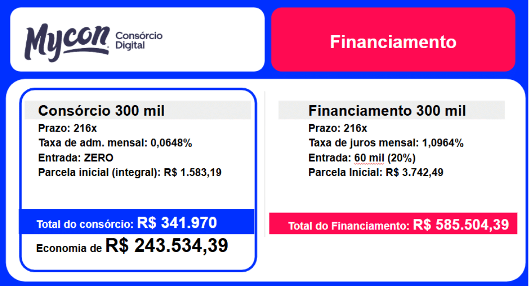 Uma simulação recente realizada pelo Mycon, primeira plataforma 100% digital de consórcios do Brasil, mostra que o consórcio pode ser até R$ 243 mil mais barato do que o financiamento tradicional na compra de um imóvel de R$ 300 mil. O levantamento considerou prazos, taxas e condições reais de mercado, com dados atualizados do Banco Central em 2025.