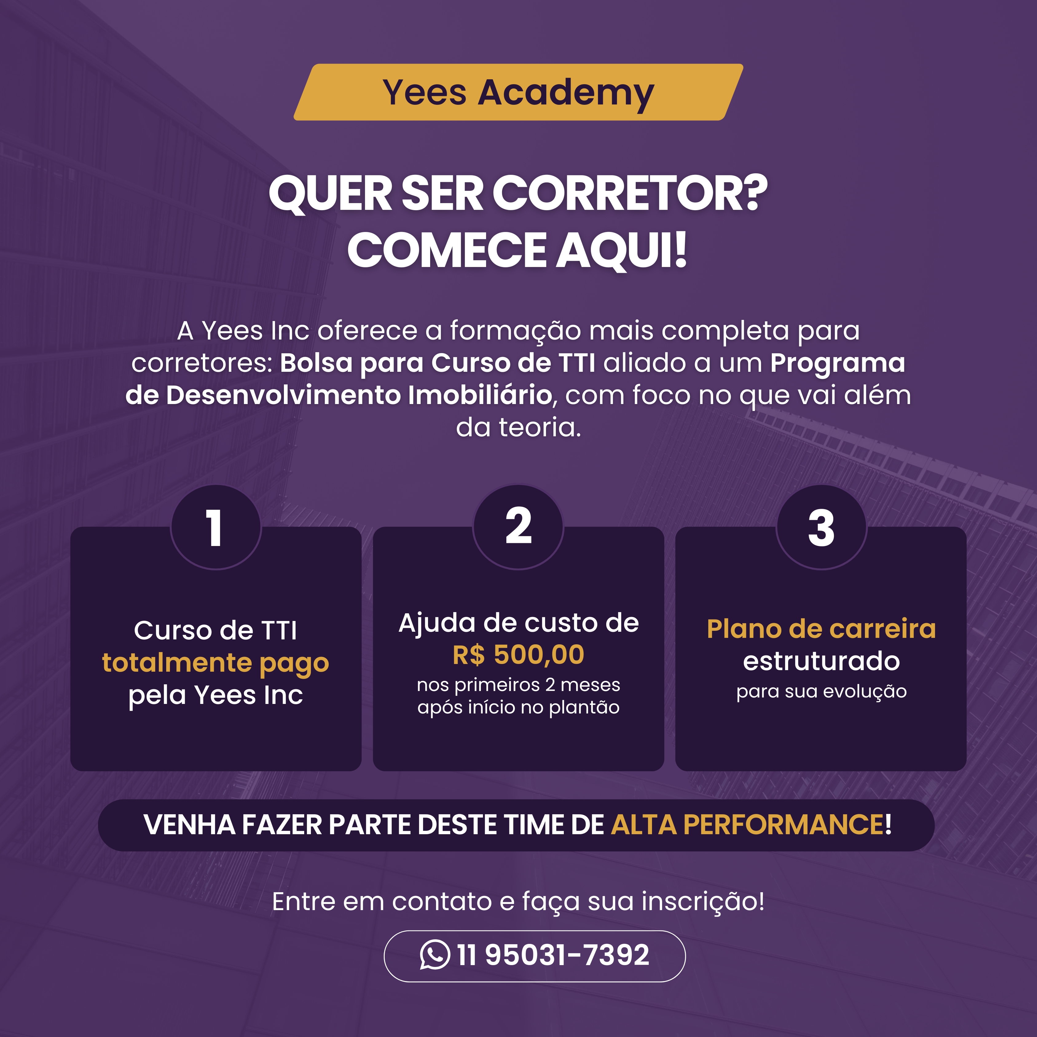 A Yees Inc anuncia a abertura das inscrições para a Yees Academy, programa corporativo voltado à formação e desenvolvimento de novos corretores de imóveis interessados em ingressar no mercado imobiliário. A iniciativa tem como objetivo identificar, capacitar e preparar profissionais para atuar de forma qualificada em um dos setores que mais cresce no país.
